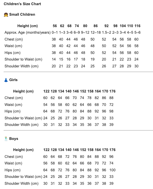 122, 128, 134, 140, 146, 152, 158, M, S, XS