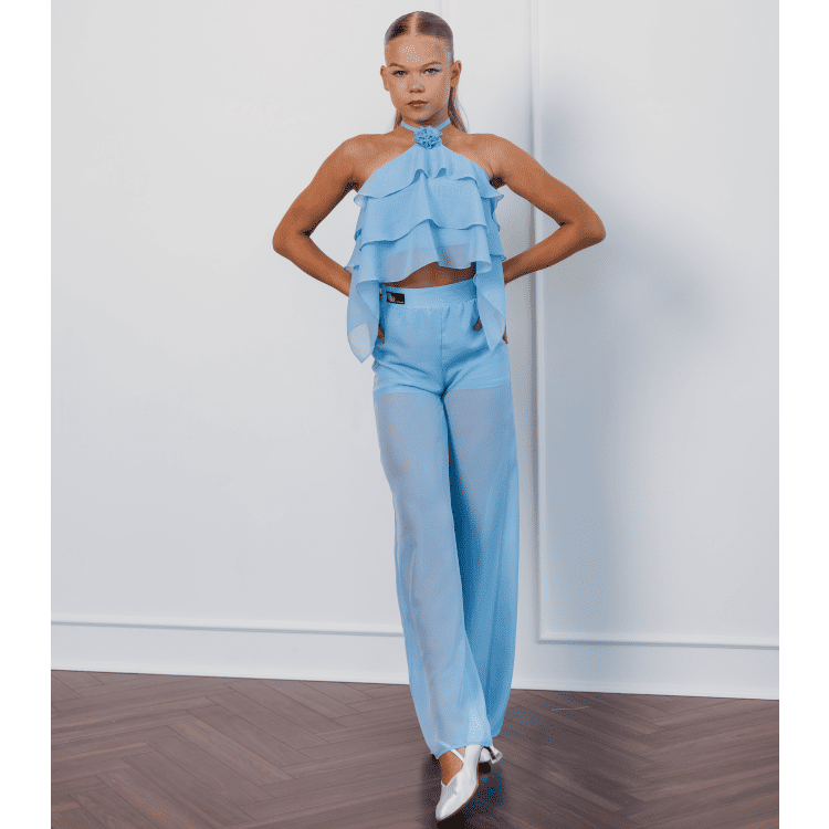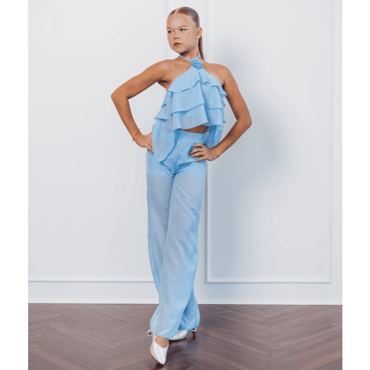 Elegant ballroom top in a soft light blue color, crafted from flowing chiffon with layered ruffle detailing. Perfect for young dancers, this stylish design combines comfort and sophistication, ensuring freedom of movement and a graceful look on the dance floor.