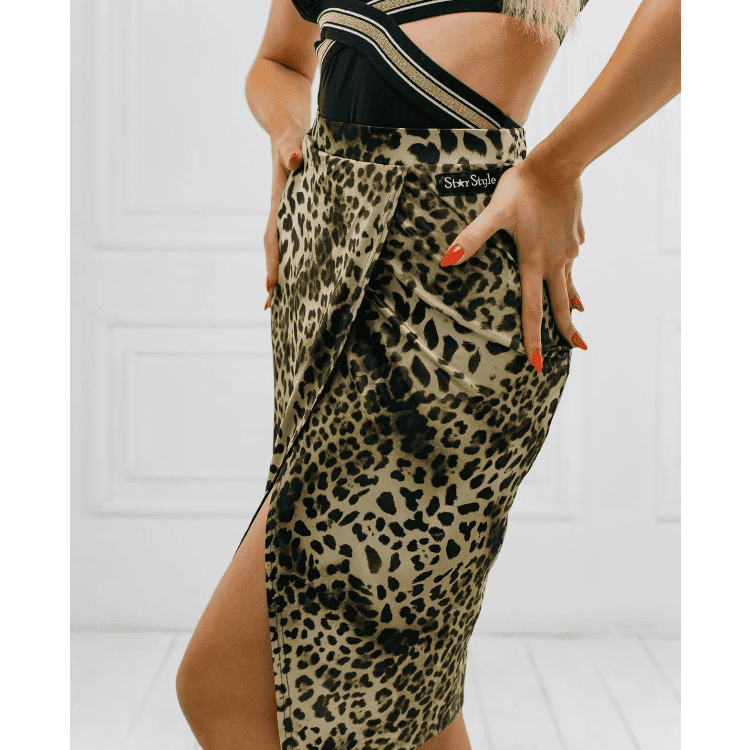 The StarStyle Leopard Skirt is designed for dancers who want to stand out on the dance floor. Its bold leopard print adds a daring and stylish touch, while the high-quality stretch fabric ensures comfort and freedom of movement. Featuring a side slit and flattering fit, this skirt enhances body lines and is perfect for both training sessions and performances.